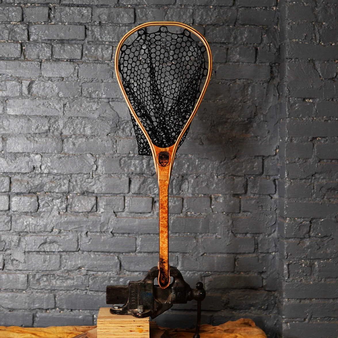 Wayward Woodshop’s flagship Fat Jake landing net is handcrafted by Tina and Justin Skaggs in their Philadelphia-based woodshop. Constructing the Fat Jake with multiple types of wood is essential for a lighter-weight net that won’t drag you down while infusing enough strength to wrangle the fattest and strongest fish. To ensure smaller river trout don’t slip out, they chose a silicone net with smaller holes.